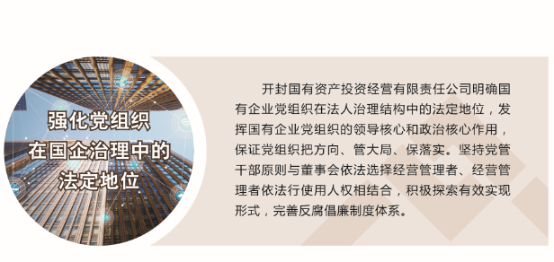 開封國投在市委市政府、市財(cái)政局的正確領(lǐng)導(dǎo)下,充分發(fā)揮領(lǐng)導(dǎo)作用,把方向、管大局、保落實(shí),依照規(guī)定討論和決定公司重大事項(xiàng)。以促進(jìn)公司經(jīng)營發(fā)展為中心,不斷加...