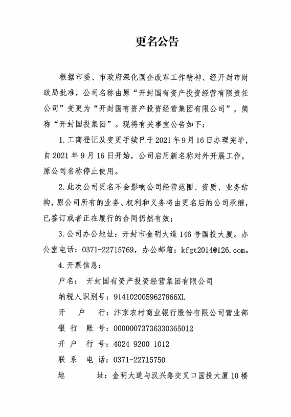 根據(jù)市委、市政府深化國(guó)企改革工作精神、經(jīng)開(kāi)封市財(cái)政局批準(zhǔn),公司名稱(chēng)由原“開(kāi)封國(guó)有資產(chǎn)投資經(jīng)營(yíng)有限責(zé)任公司”變更為“開(kāi)封國(guó)有資產(chǎn)投資經(jīng)營(yíng)集團(tuán)有限公司”,...